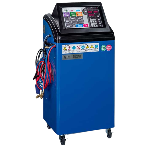 自動車用エアコンに使用される冷媒(フロンガス)の回収・再生・真空引き・充填を一台で行う整備機械です。